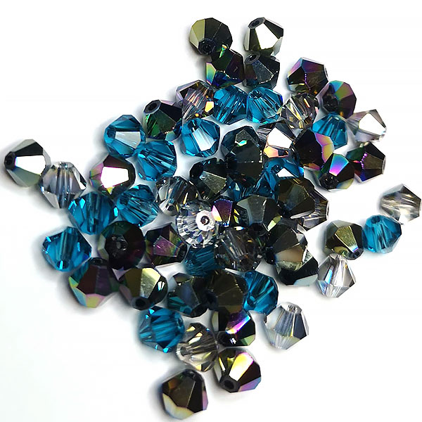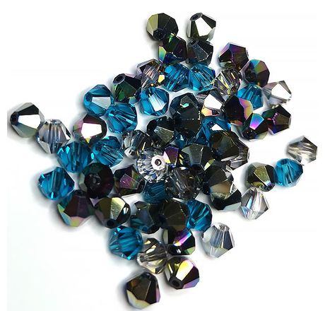 Blue Mix: can include opaque to transparent cobalt, opaque to transparent light blue, transparent frosted light blue, transparent clear AB and transaparent blue AB.