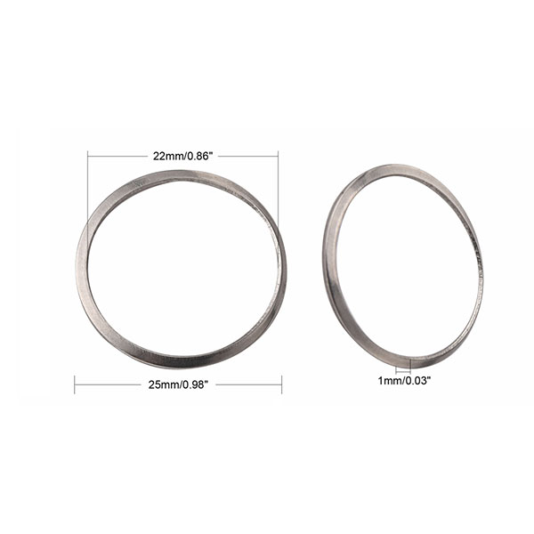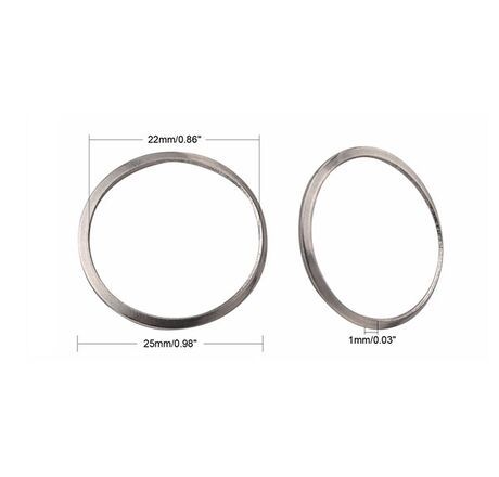 Stainless Steel Rings (201). 25mm Outer Diameter, ~1.5mm wire Diameter, 22mm Inner Diameter. These rings have a slight concave, they aren't completely flat.